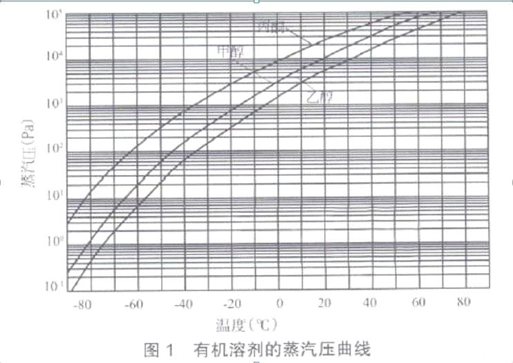 原料藥生產常用的溶媒是甲醇、丙酮、乙醇等有機溶劑或其他復合溶劑,它們的共同特點是低沸點、高飽和蒸汽壓。對于抽濾和干燥工藝來說,通常有真空泵前和泵后冷凝兩種方式,也稱為進氣側冷凝和排氣側冷凝,都需要把介質冷卻到工作壓力對應的沸點之下。幾種常用有機溶劑的蒸汽壓曲線(見圖1)。從曲線看出,在干燥工藝的極限壓力范圍(0.1 ~100 Pa)內,三種溶劑的沸點在-90℃與-30℃之間,必須采用深冷或冷阱冷凝。而在常壓下(≤ 1.013×105Pa),三種溶劑的沸點在56℃與78℃之間,只須用循環水即可冷凝。二者比較,排氣側冷凝回收的條件最簡單,也是最經濟的。
