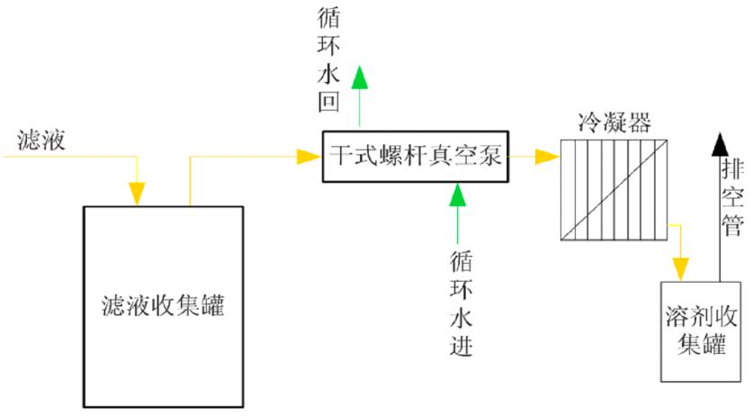 在制藥工藝中有很多的步驟需要將固、液混合物中的固體與液體分離,在這個分離過程中大多使用抽濾方式來實現。實驗測試液體組成為95:5的丙酮、乙醇混合液,使用干式螺桿真空泵的工藝流程如下: